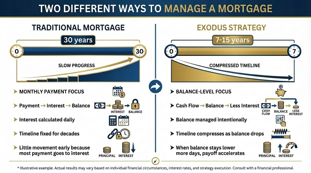 Traditional mortgage thinking focuses on the monthly payment. The Exodus Strategy focuses on something different: